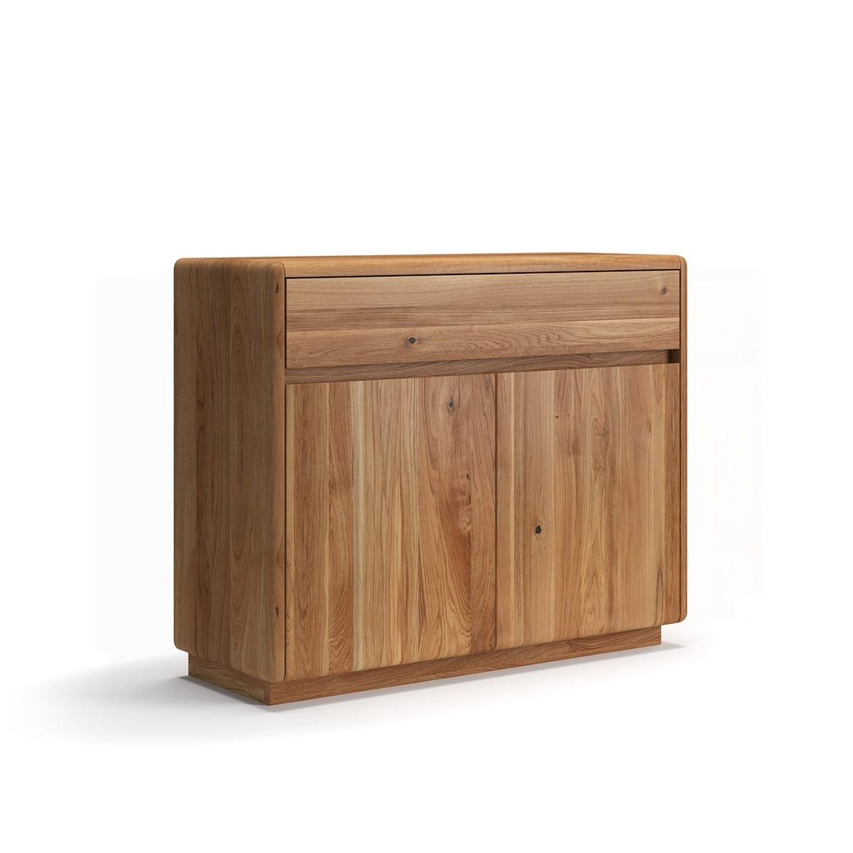 Komoda Ronda z kolekcji Dębowy Sen wykonana z litego, olejowanego drewna dębowego w naturalnym odcieniu. Komoda wyposażona w jedną, pojemną szufladę umiejscowioną w górnej części mebla oraz 2 półki znajdujące się za parą drzwiczek w dolnej części bryły.